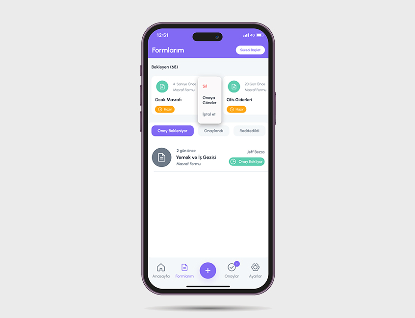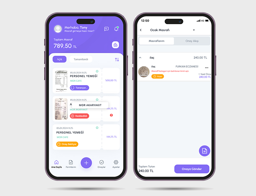 - Masrafları otomatik onaya gönderir: Masraf politikalarını göz önünde bulundurarak girilen masrafları otomatik yönetici onayına gönderebilirsiniz. Yöneticiler ise masrafları mobilden kolayca onaylayabilir. Esnek altyapısı sayesinde, standart onay yapısına ek olarak şirkete özel limit, departman ve kategori bazlı onay mekanizmalarını destekleyebilirsiniz.